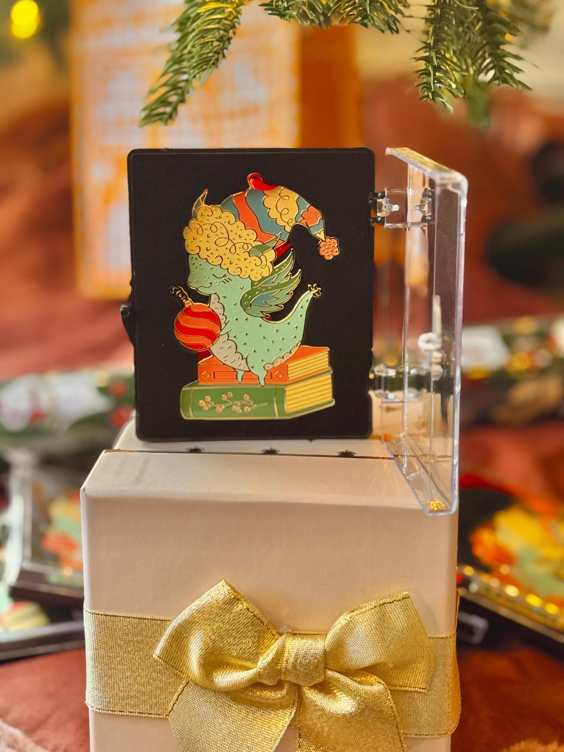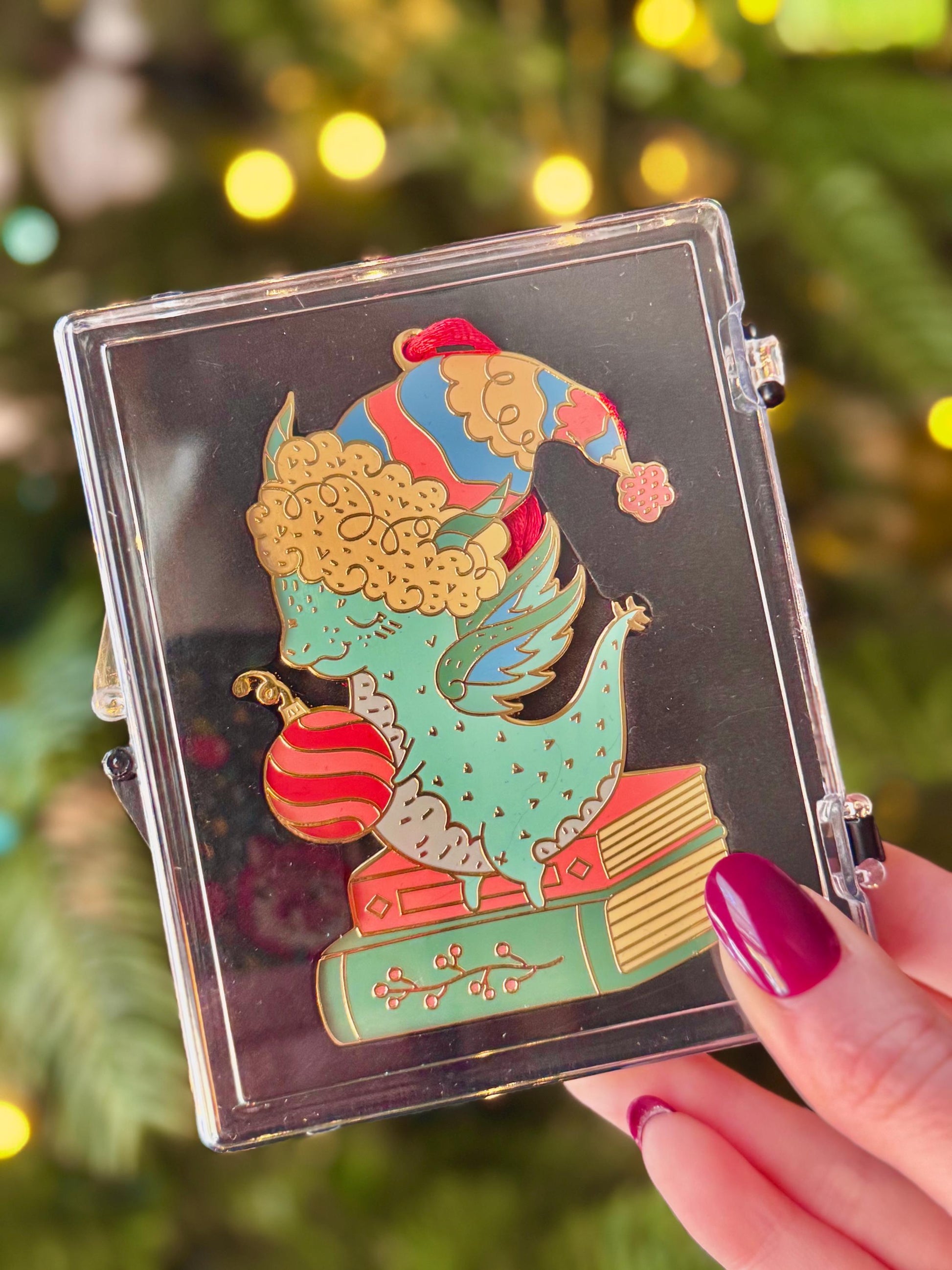 Bookish Dragon Christmas Tree Ornament, Gold Plated Enamel with gift box, Fantasy Reader Christmas Gifts, Holiday Stocking Stuffer
