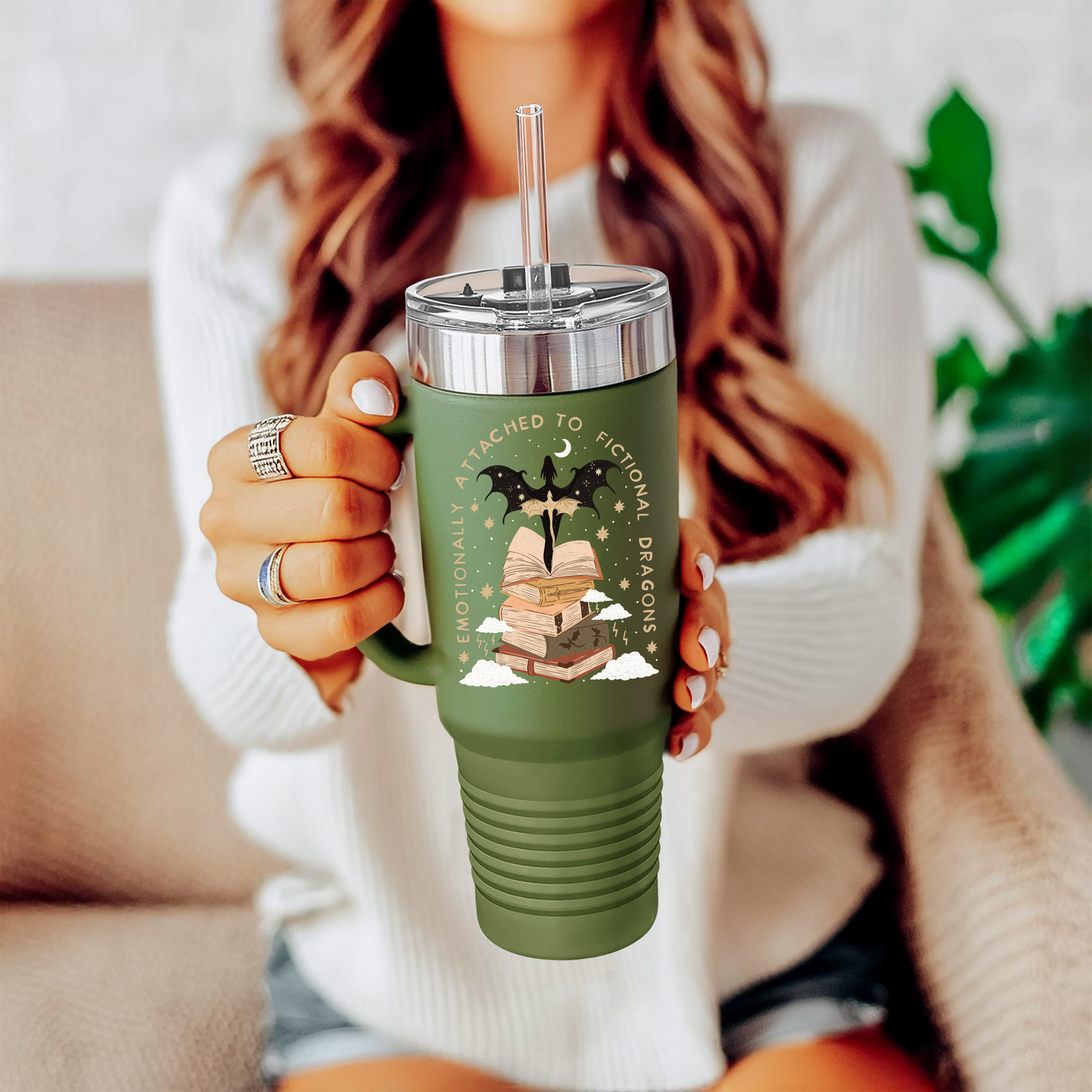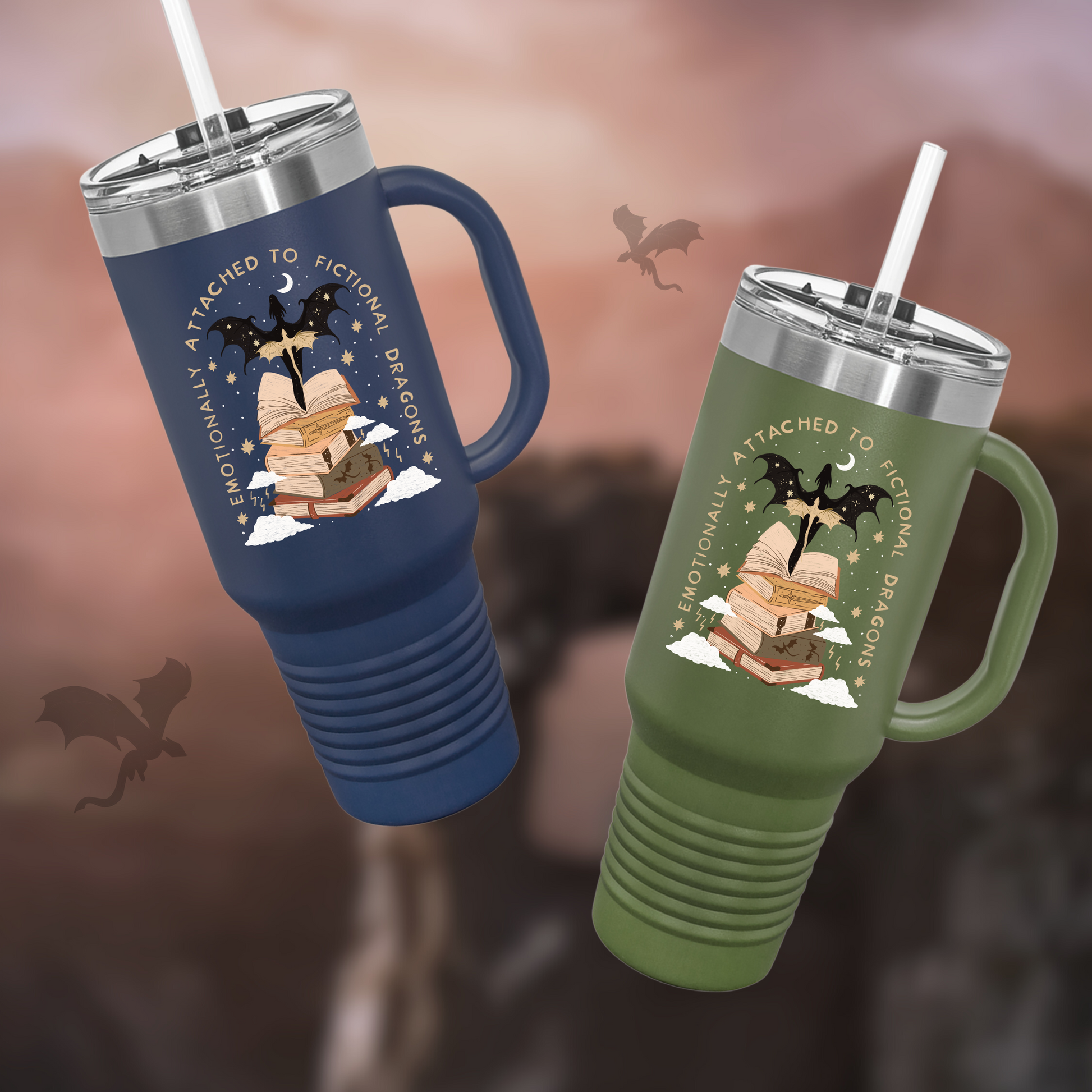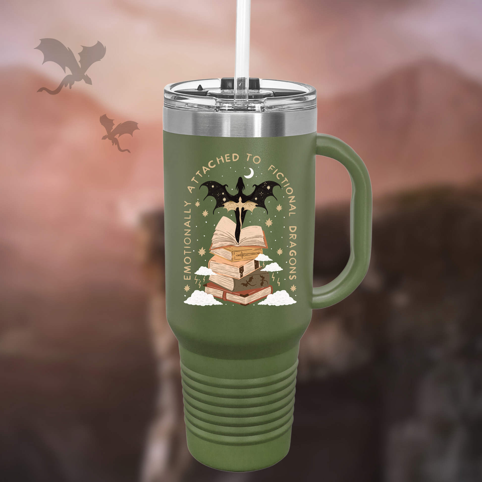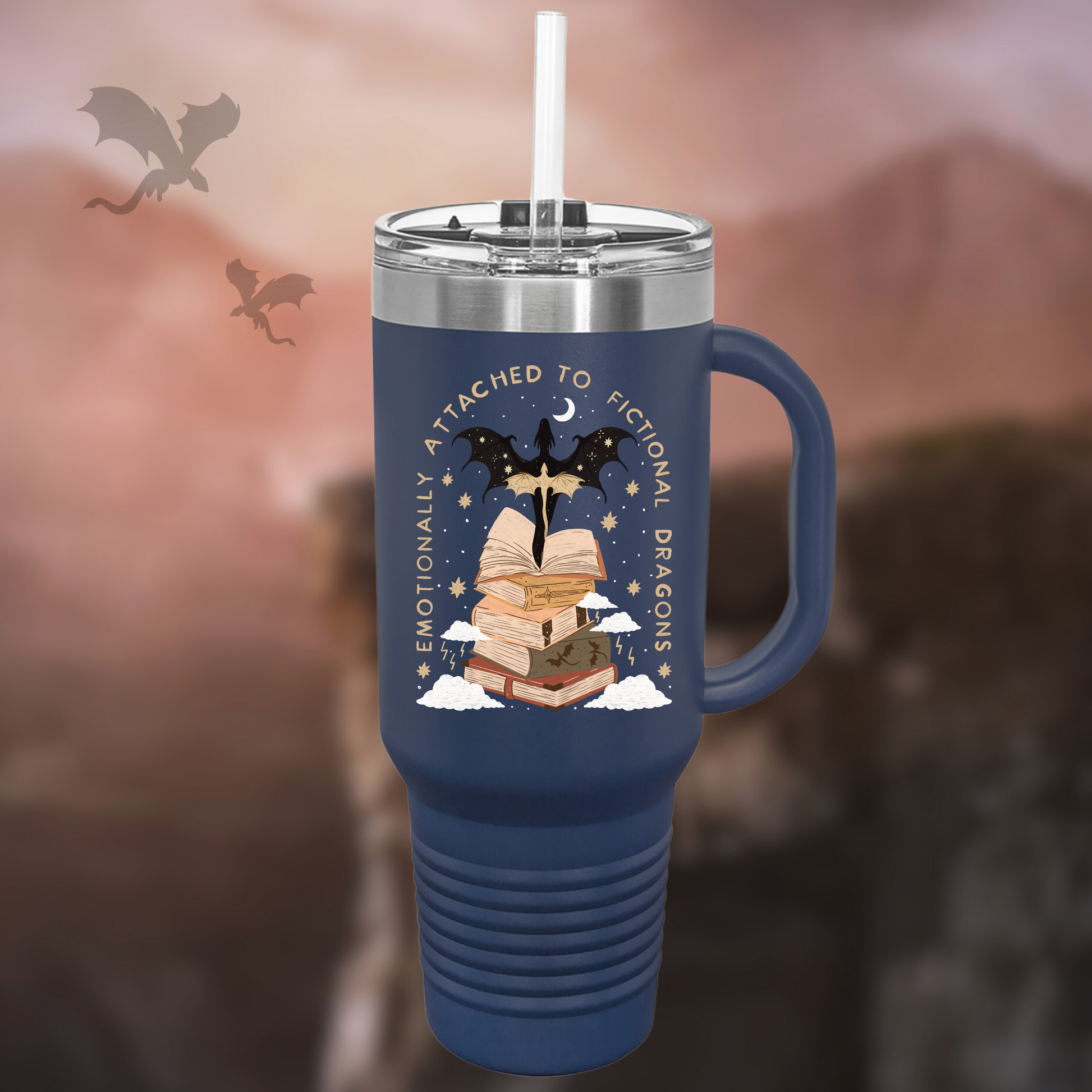Indulge in your love for fantasy and dragons with the Emotionally Attached to Fictional Dragons Bookish 40z Tumbler. Keep your favorite beverage hot or cold while displaying your bookisd side. Perfect gift for bookworms and fantasy enthusiasts.