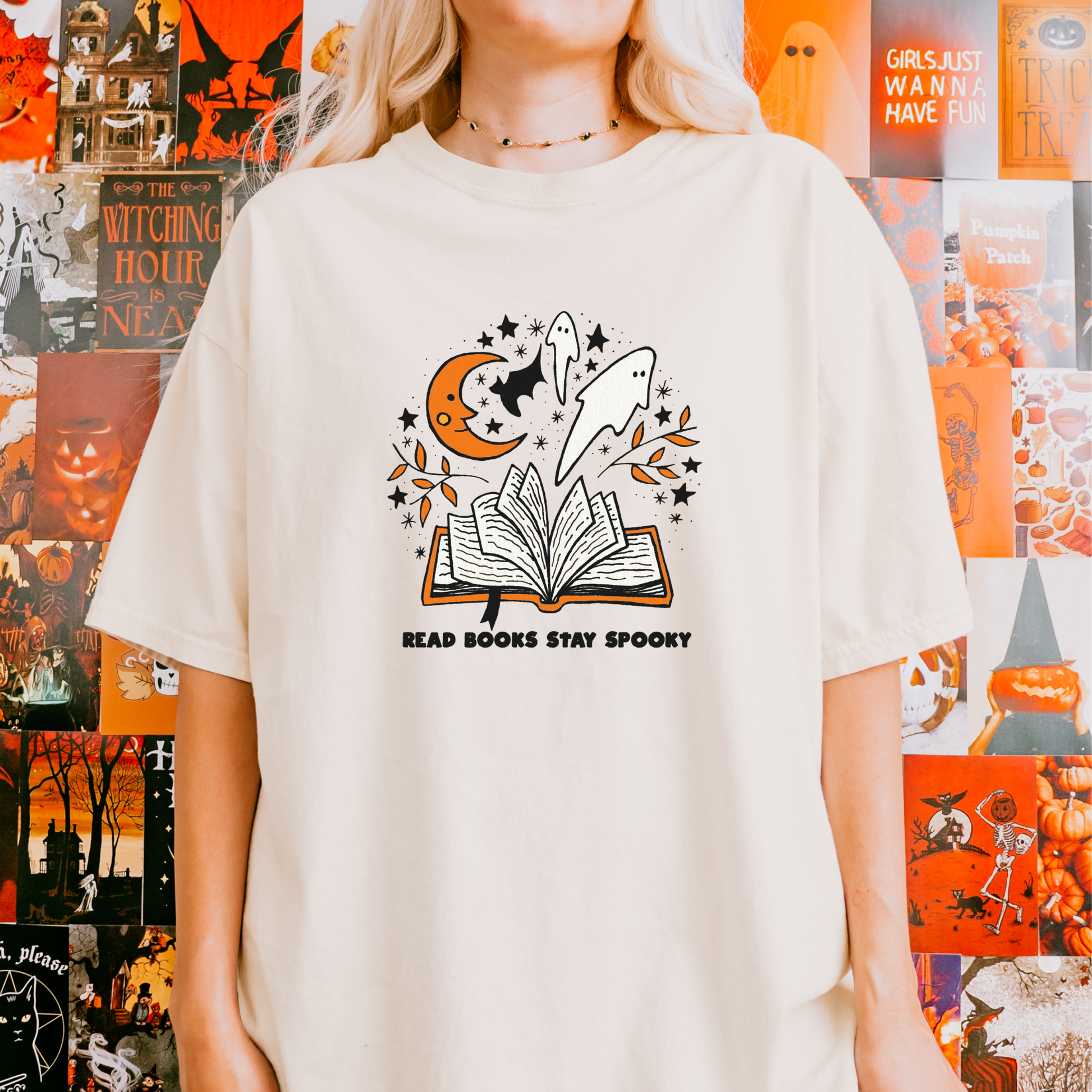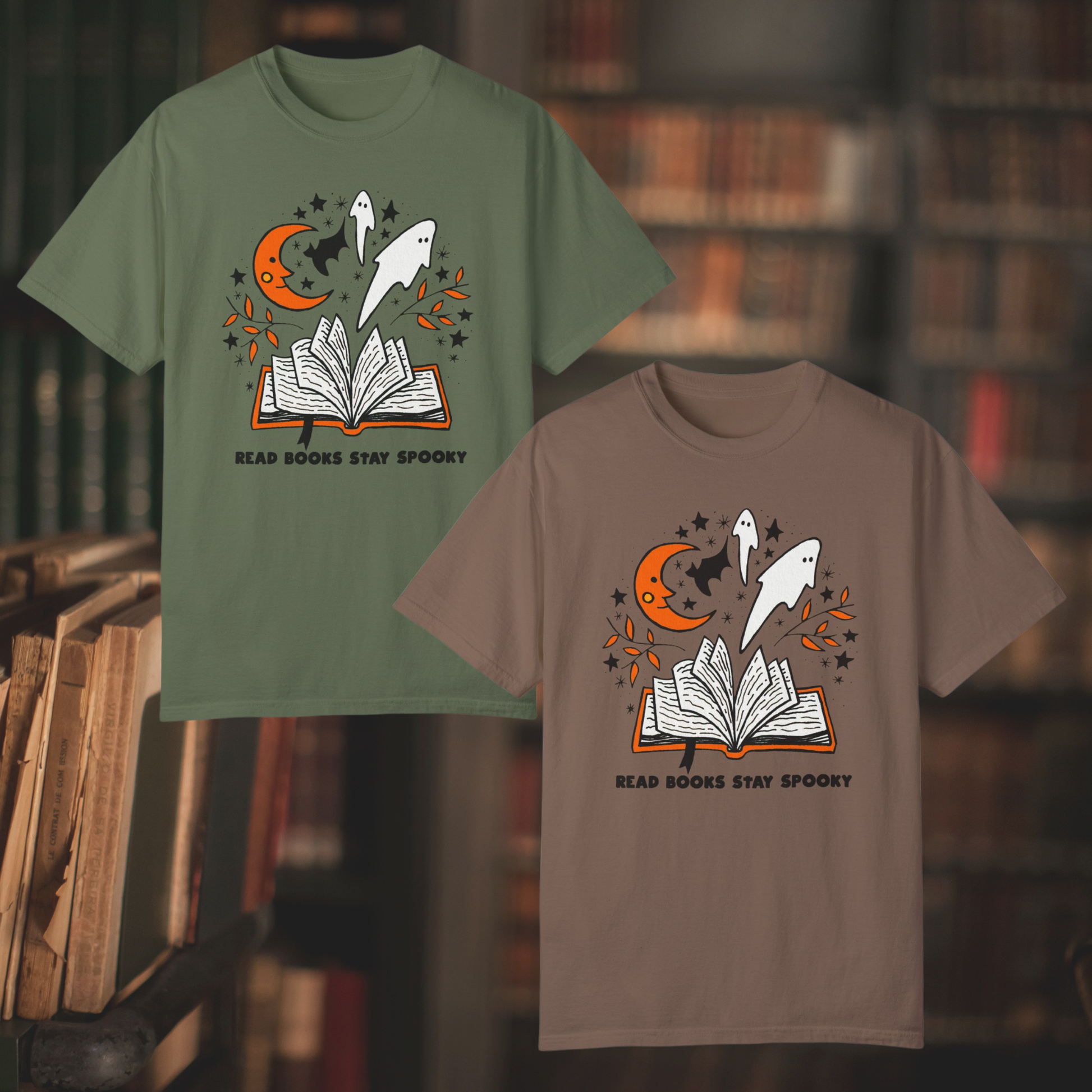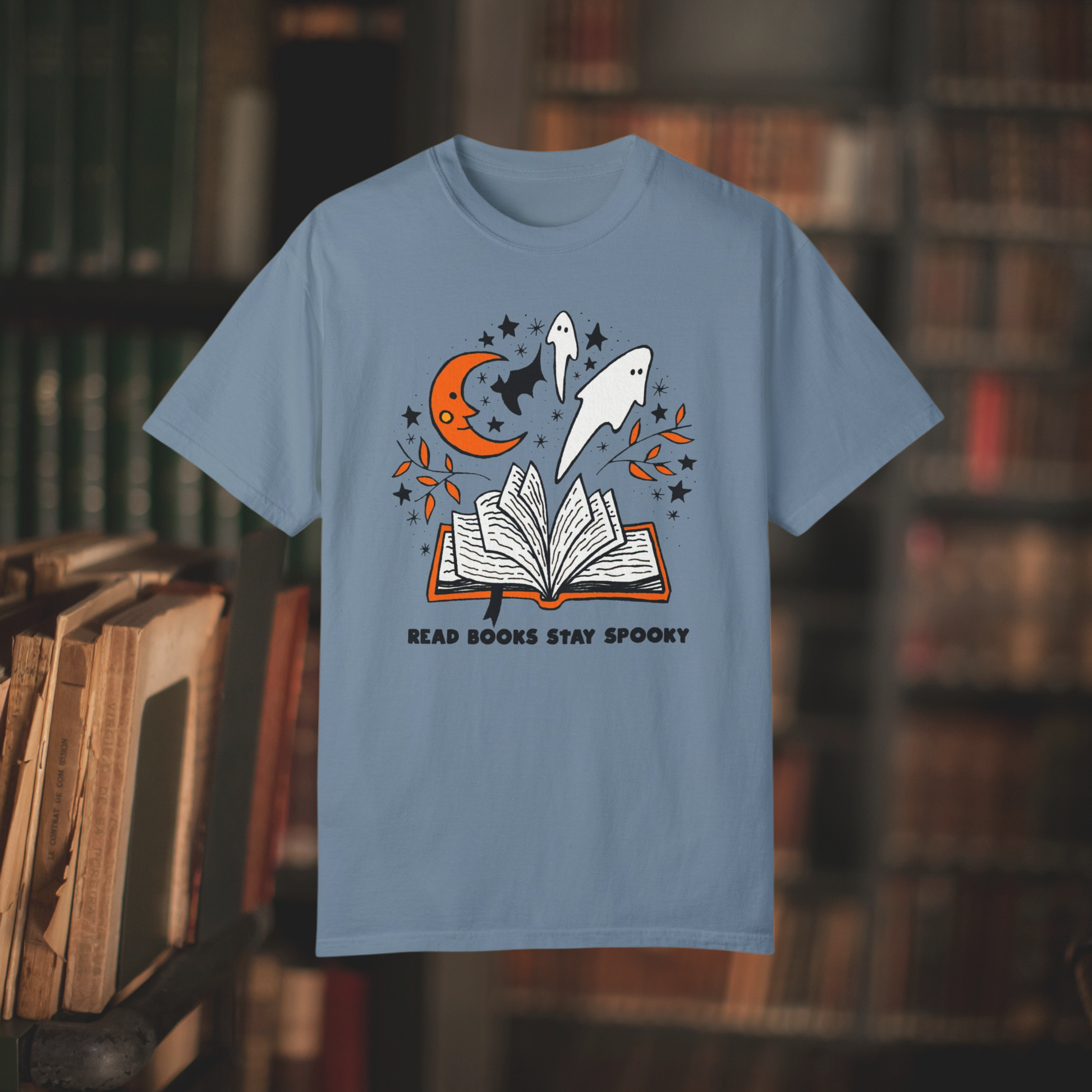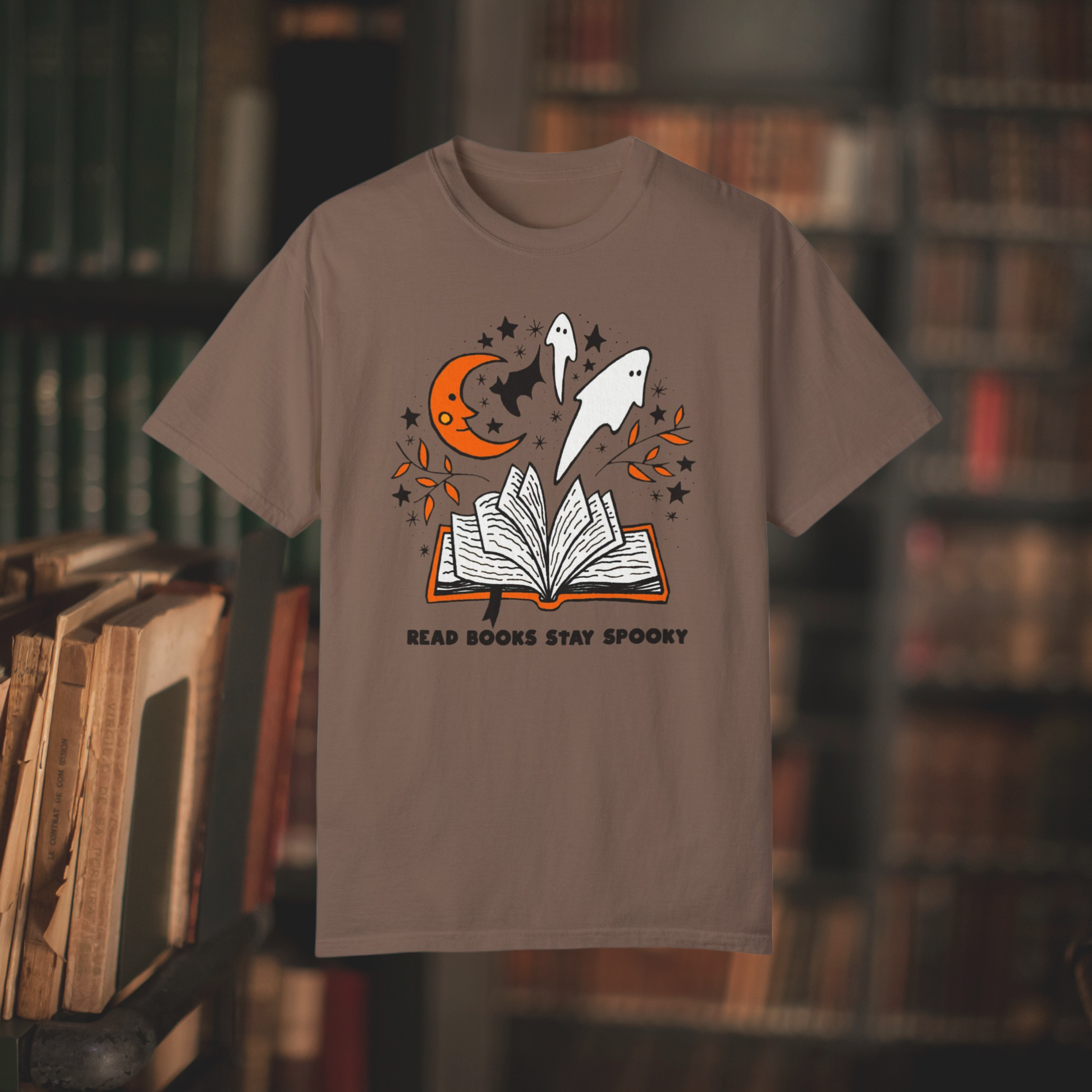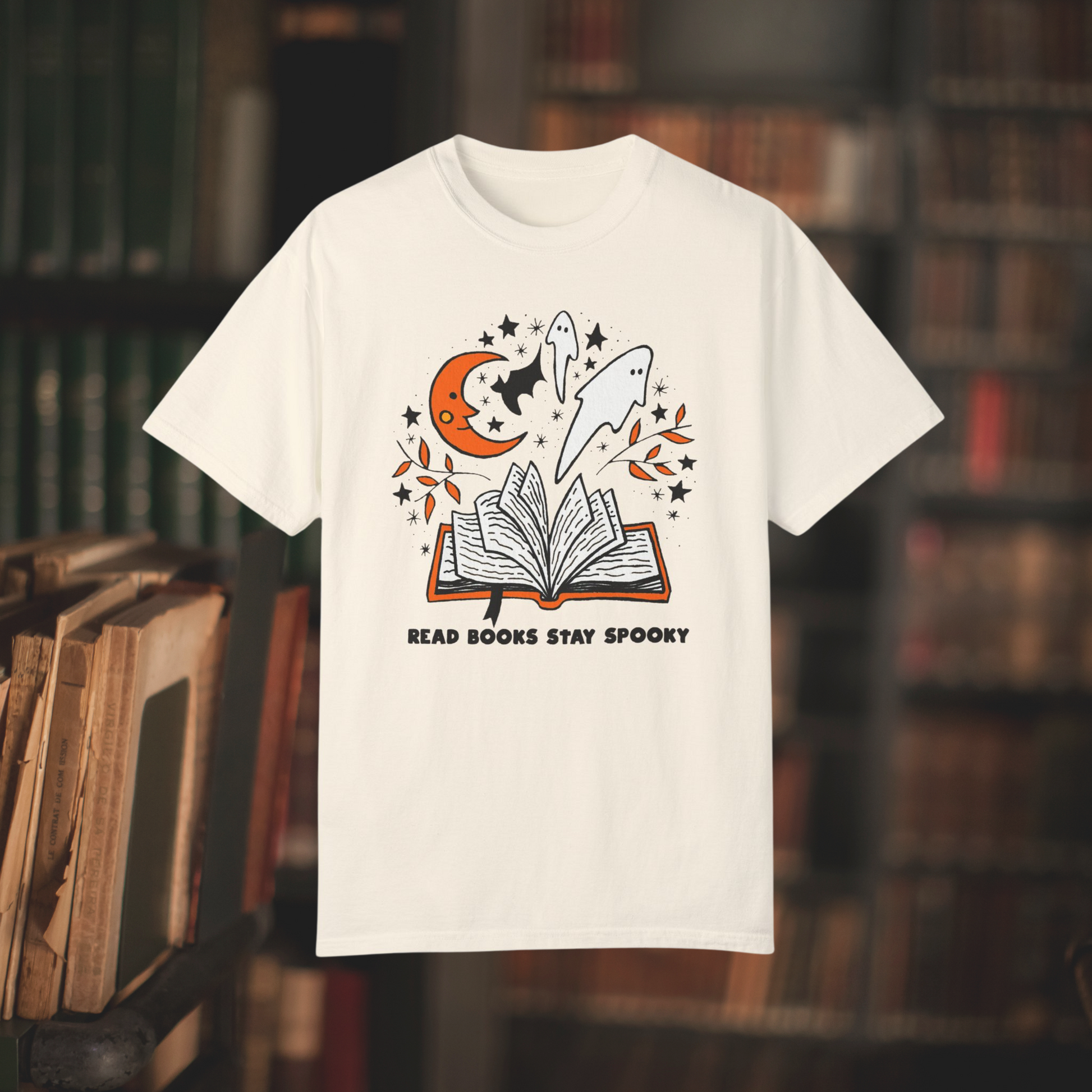 Enhance your spooky vibes with this bookish T-shirt for Halloween! Ideal for autumn book lovers, this whimsical design is bound to be a hit. Embrace your affection for the spooky and adorable with this trendy tee.