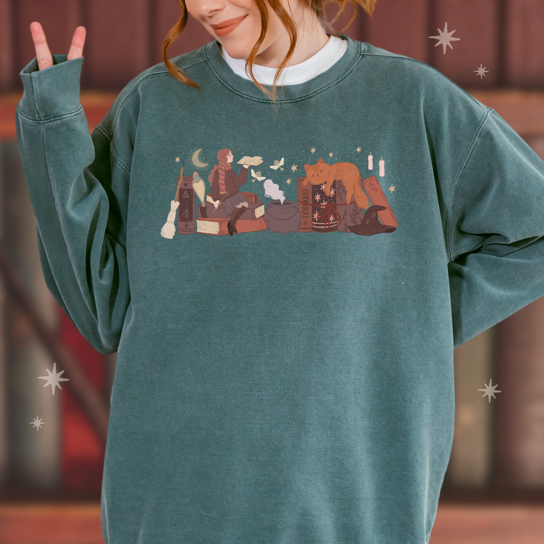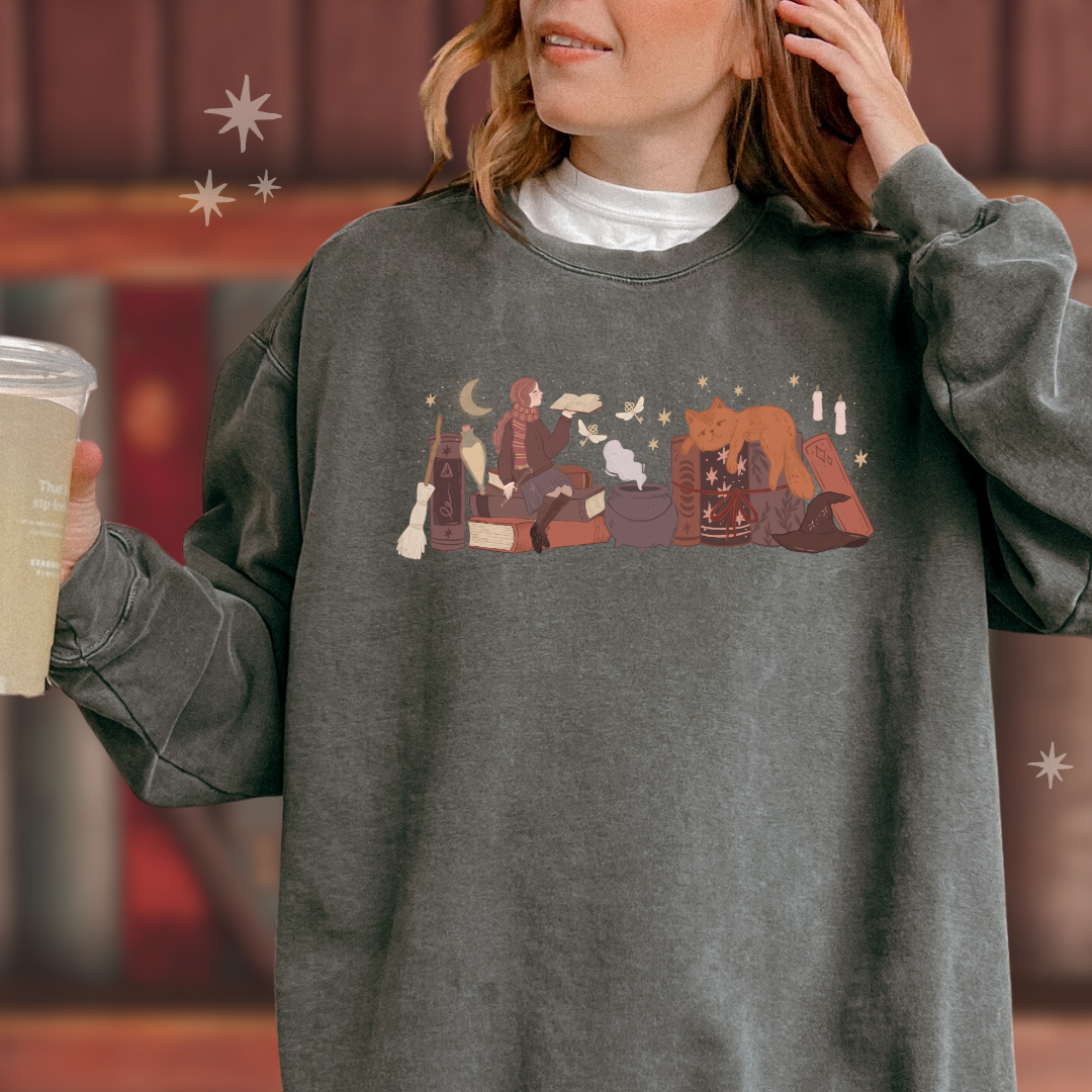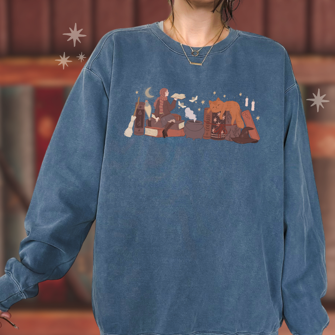 Get ready to cast a spell with this potter themed T-Shirt. Featuring the Brightest Witch with her beloved cat and books, this shirt is perfect for any bookish witch or wizard. Show off your love for the magical world with this tee. Accio shirt!