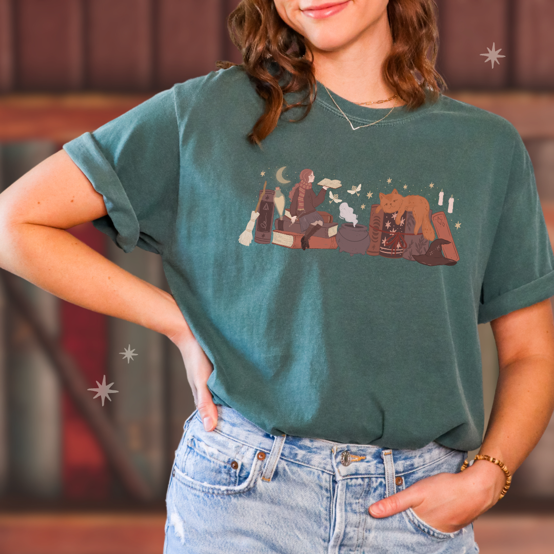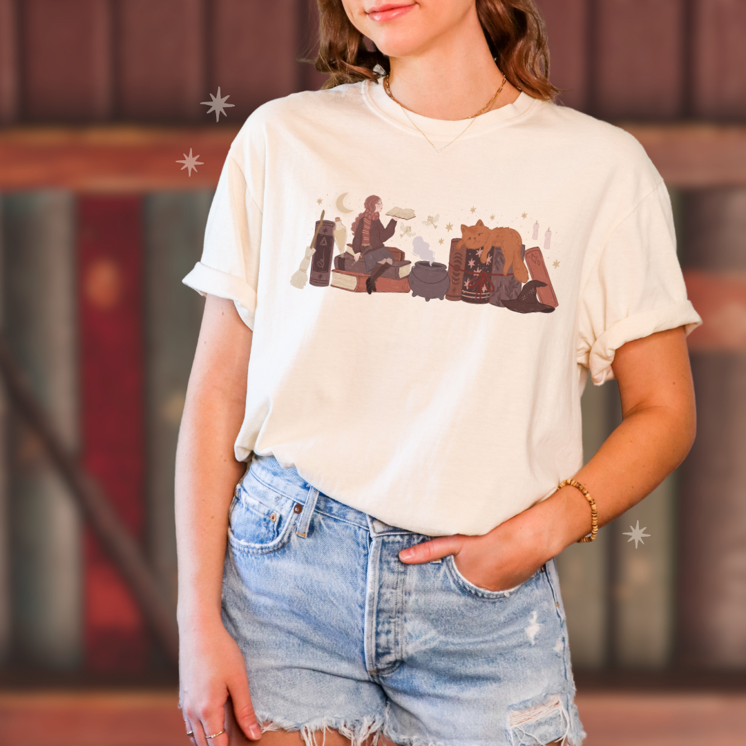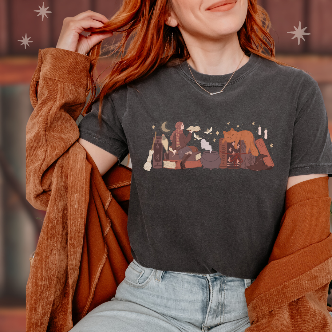 Get ready to cast a spell with this potter themed T-Shirt. Featuring the Brightest Witch with her beloved cat and books, this shirt is perfect for any bookish witch or wizard. Show off your love for the magical world with this tee. Accio shirt!