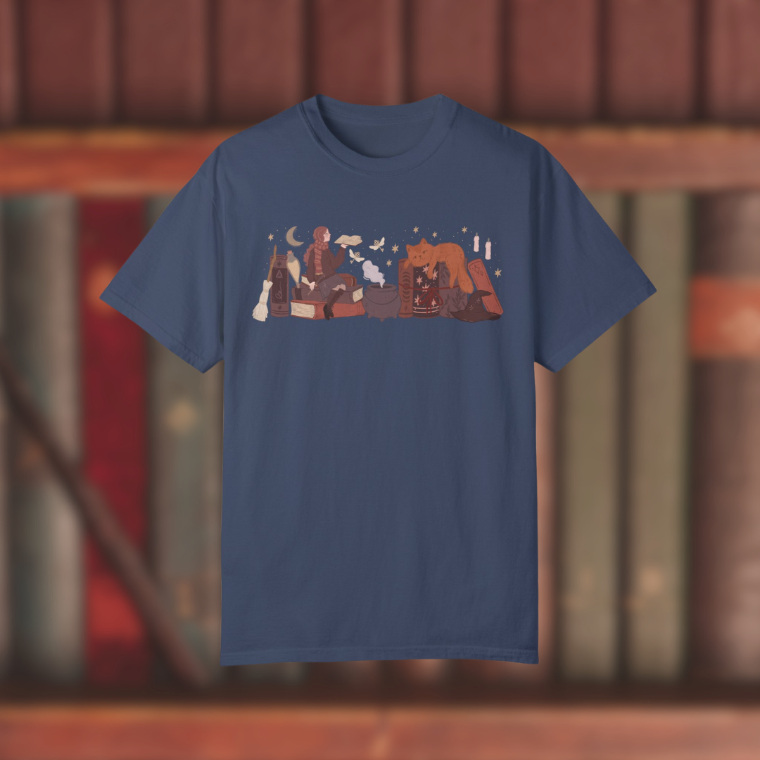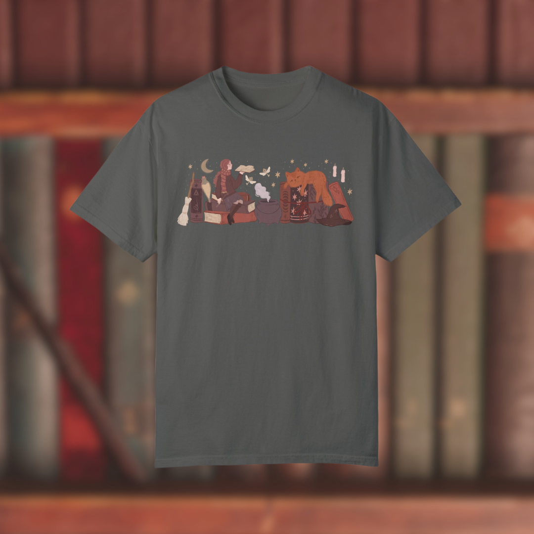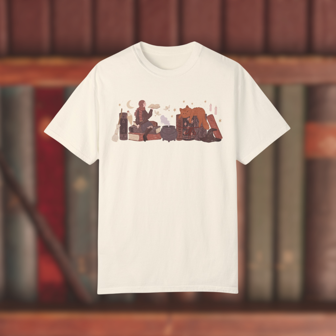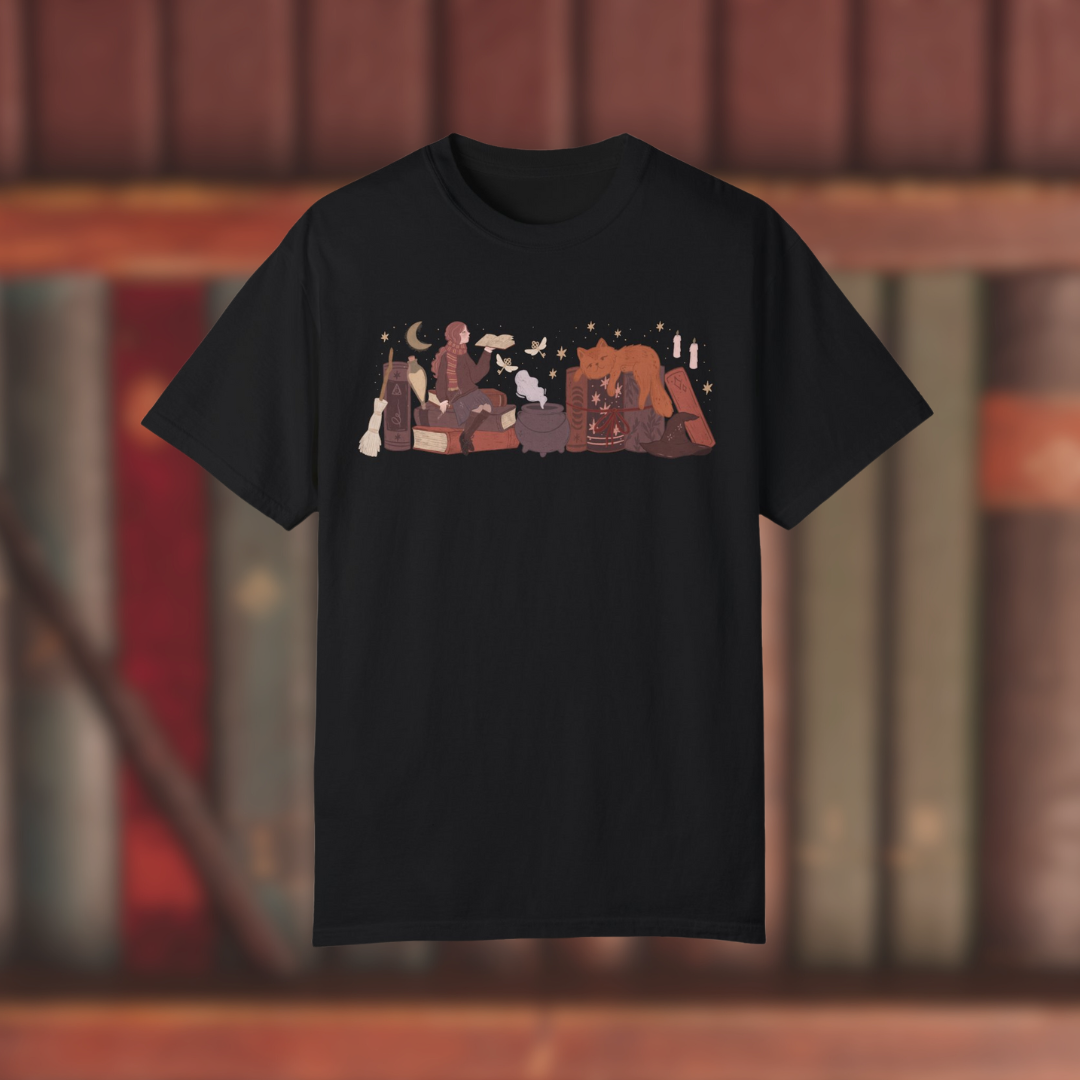 Get ready to cast a spell with this potter themed T-Shirt. Featuring the Brightest Witch with her beloved cat and books, this shirt is perfect for any bookish witch or wizard. Show off your love for the magical world with this tee. Accio shirt!